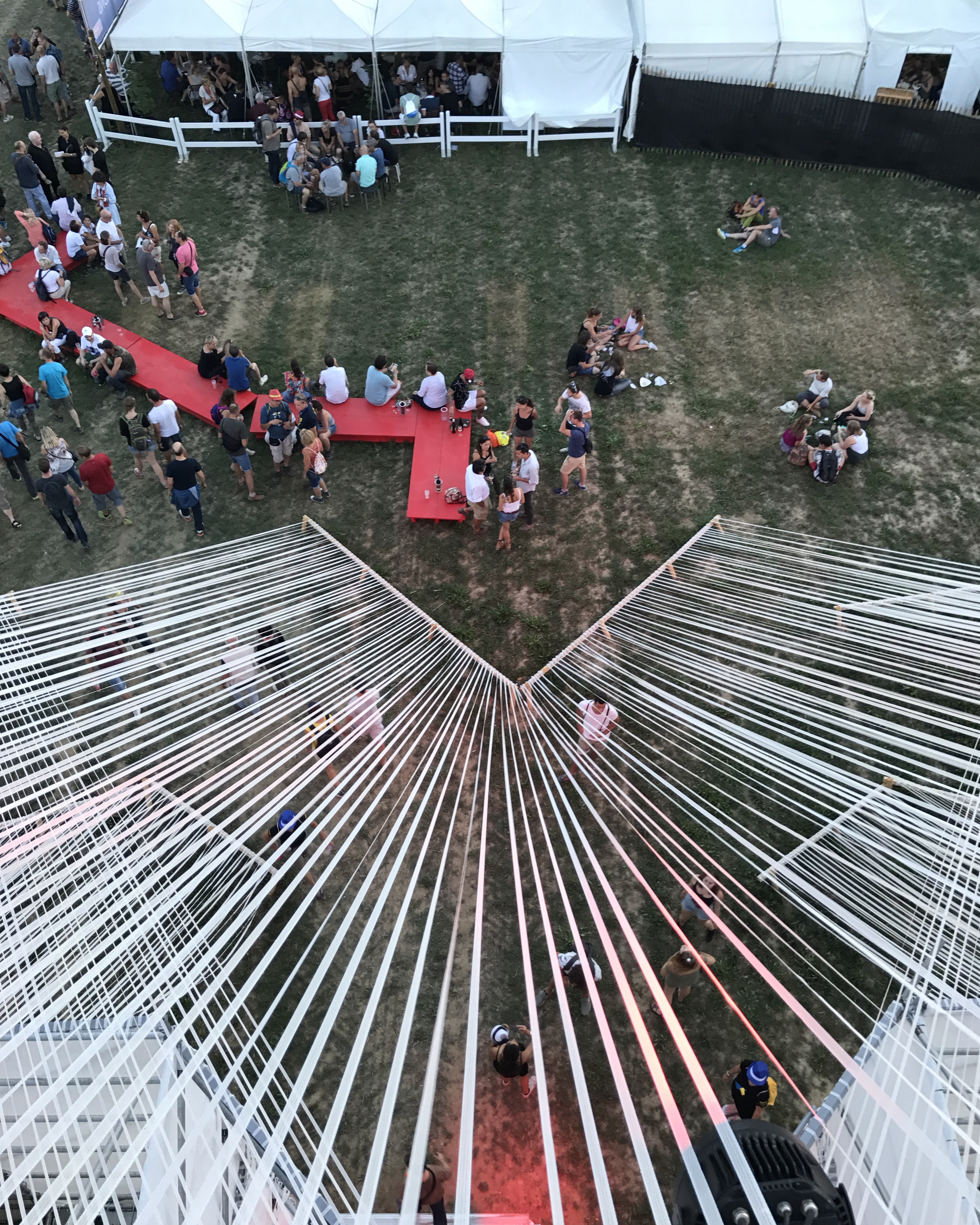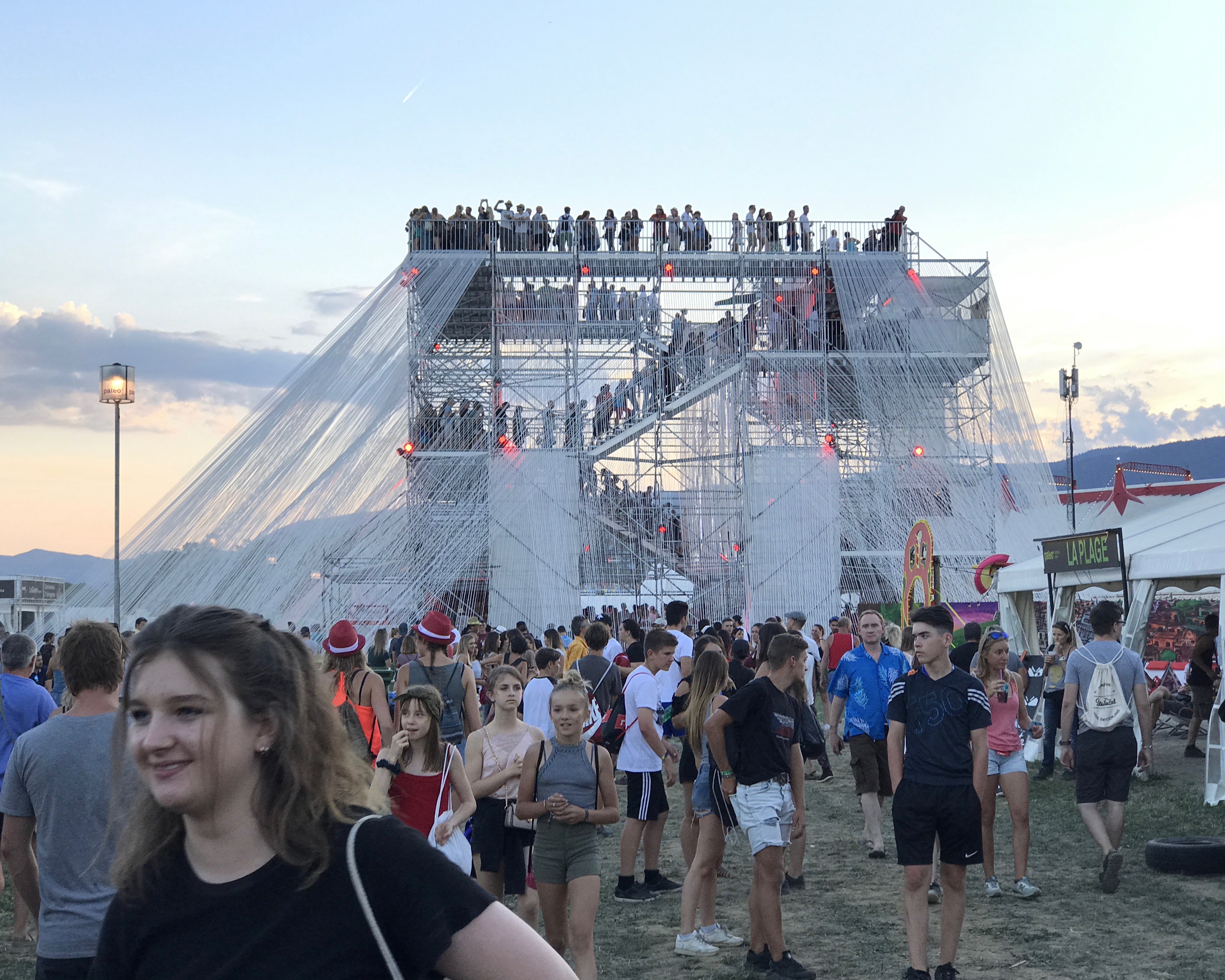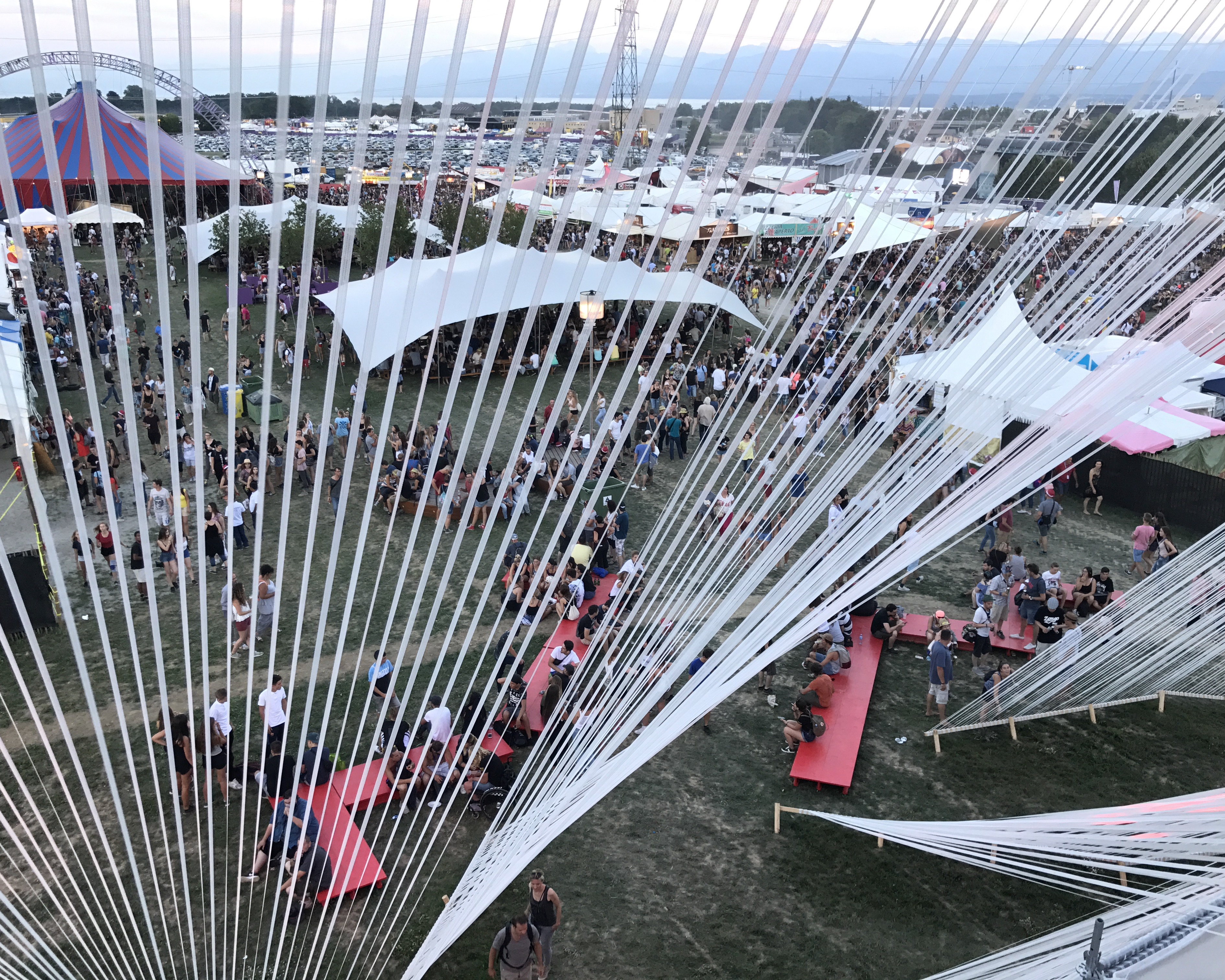 Oui Nyon, ce n’est pas que de la musique, c’est un petit monde que l’on est heureux de retrouver chaque année, des lieux, des nouveautés aussi, comme cette année, ce volcan fabriqué de 50 kilomètres de ruban blanc conçu par la HES-SO (haute école spécialisée de Suisse occidentale), sur lequel on peut monter, et qui nous donne un magnifique point de vue sur le festival.