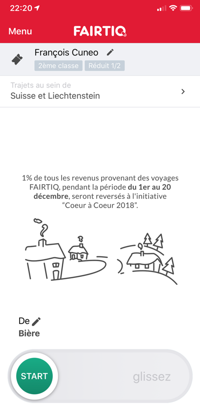 - mettre sont ON le trajet AVANT le départ du moyen de transport, et si vous ne l’avez pas fait, alors le billet ne sera pas généré, ce qui est, dirons-nous, un tout petit peu normal, parce que sinon, on voit bien les abus dont souffriraient les compagnies de transport, avec des voyageurs qui mettraient en route Fairtiq seulement quand ils voient le contrôleur poindre dans le wagon;