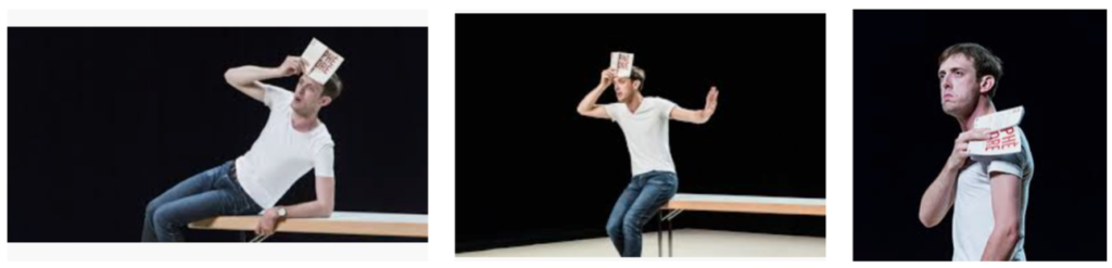 Cet acteur est incroyable, jouant son personnage de conférencier et tous ceux de la pièce, avec un simple bouquin (celui de la pièce contemporaine, donc avec le point d’exclamation) qu’il place là où il faut sur son corps pour représenter les personnages principaux.