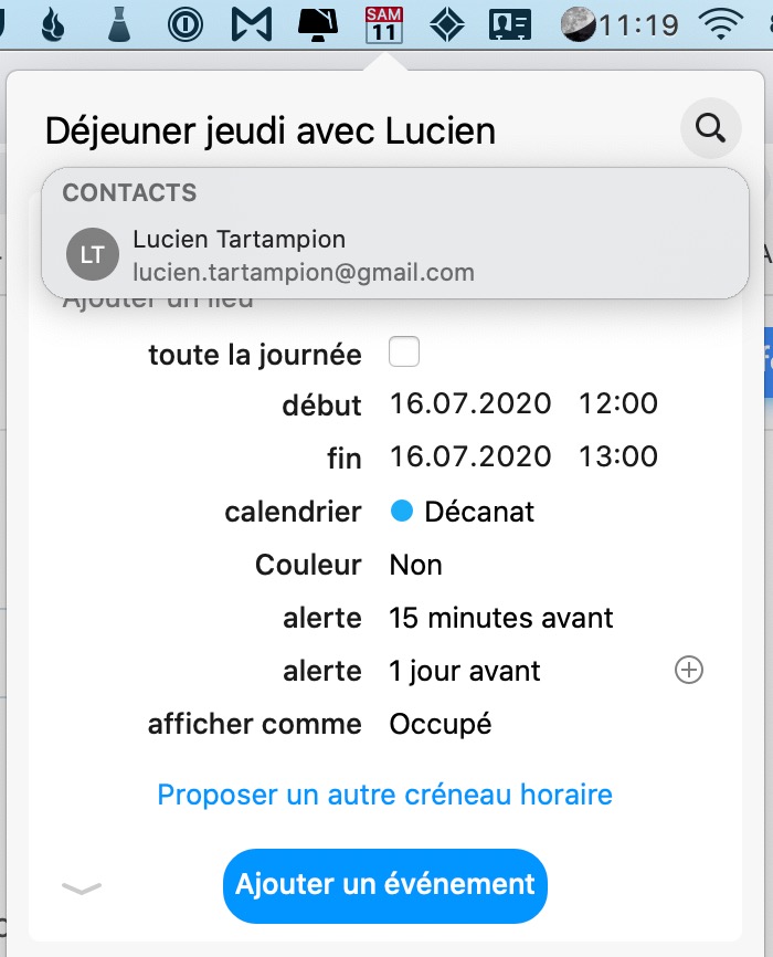 Ainsi, si je tape « Déjeuner avec Lucien aux Trois Sapins », Fantastical va me proposer Tartampion puisqu’il a vu que l’un de mes contacts s’appelle de ce nom et le restaurant « Les Trois Sapins », proche de ma localisation en indiquant comme heure de départ midi.