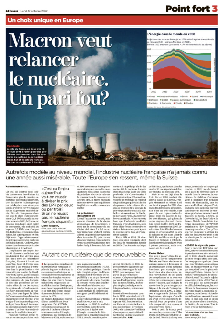 Non, mais vous vous rendez compte? Selon lui, il faudrait donc tout miser sur le nucléaire! C’est complètement dément!