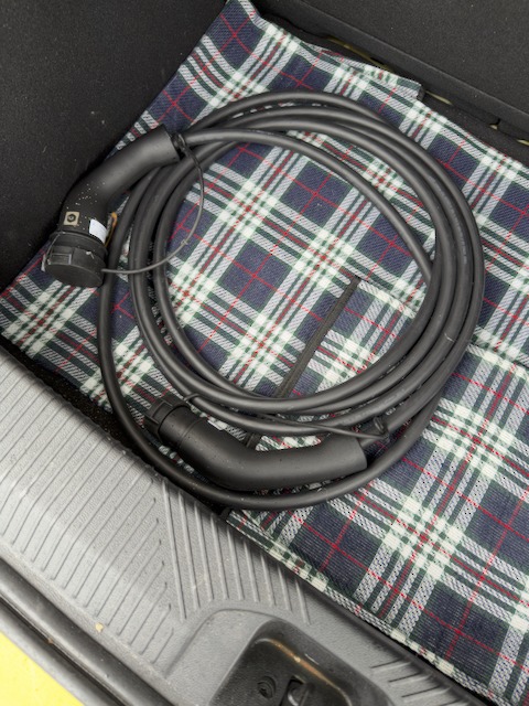 Bon, j’ai compris, je mets ce foutu câble, bien lourd, difficile à enrouler (qui consomme donc de l’énergie à transporter), soit dans le coffre, soit devant la banquette arrière.