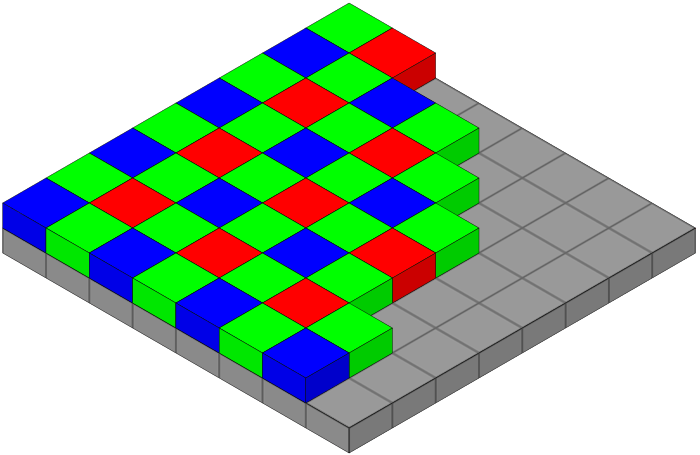 C’est ce principe qui permet de capturer l’information colorée sur tout le capteur, chaque pixel ne « voit » qu’une seule couleur à la fois la couleur finale de l’image sera calculée numériquement grâce à l’interpolation des pixels voisins.